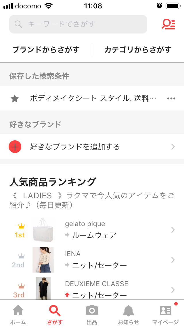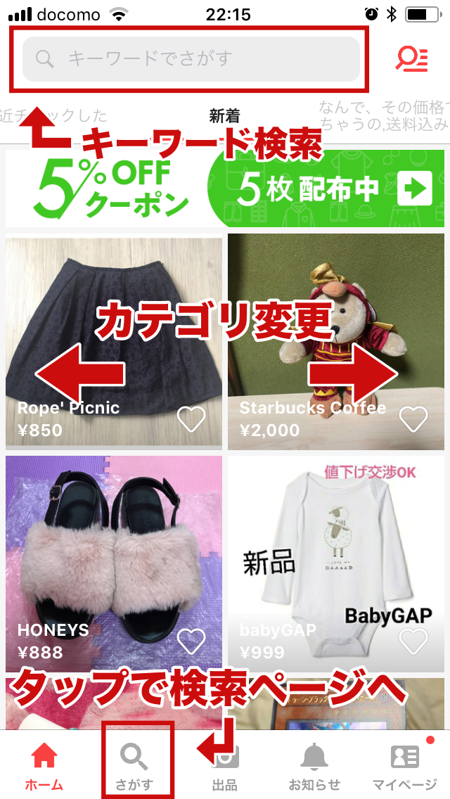 ラクマのトップ画面には、「新着」が表示されていますね。
