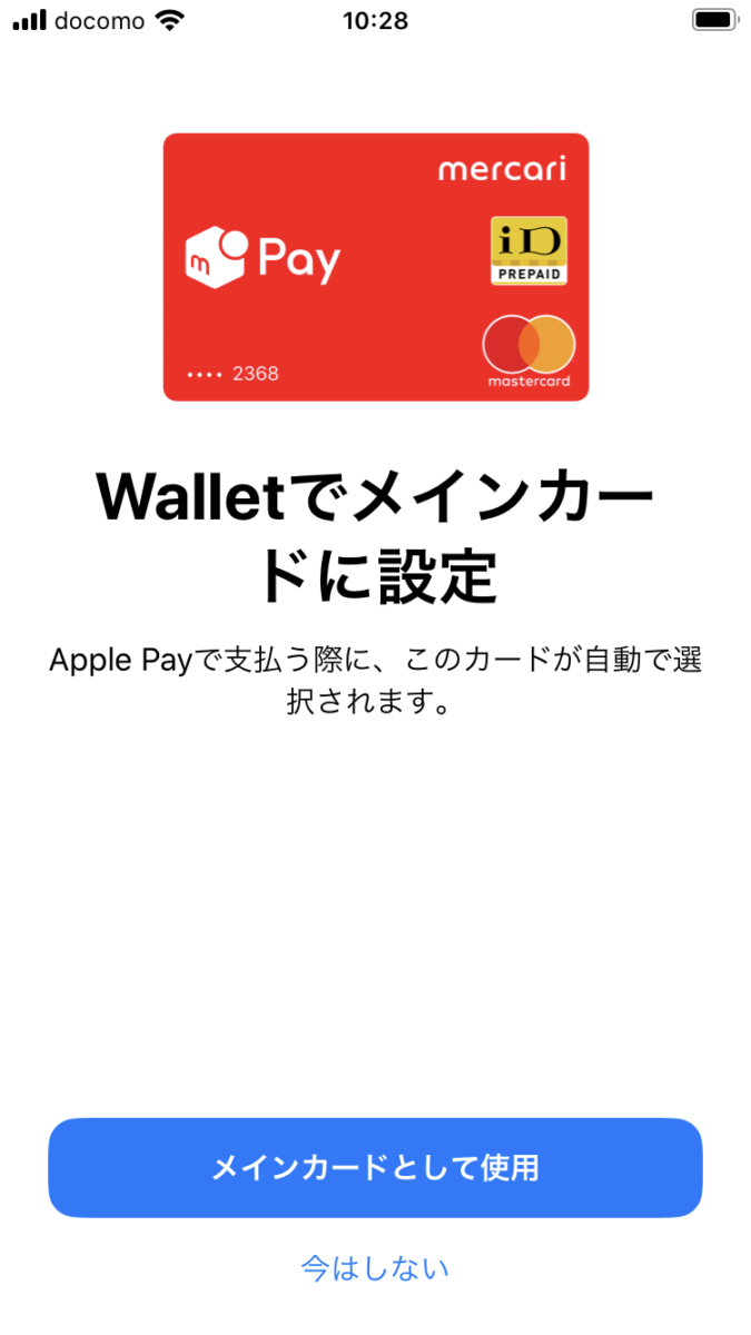 メルペイのiDカードができましたね。「メインカードとして使用」をタップすると、Apple Payでもメルペイが使えるようになります。