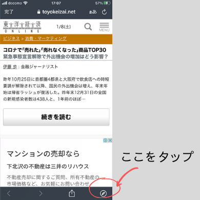 右下のコンパスっぽいマークをタップすると、さっきデフォルトのブラウザに設定したBraveで開けます。1タップでかんたん!