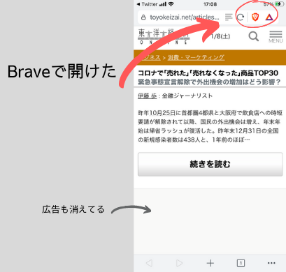 Twitterのリンク先をBraveで開いて広告無しで見る方法