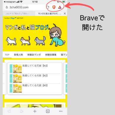 iPhoneでデフォルトブラウザをBraveに変更しておくと、インスタからのリンクは2タップでBraveで開けます。
