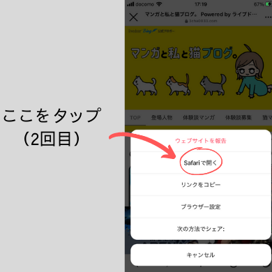 では画面右上の「…」をタップ(1回目)し、「Safariで開く」をタップ(2回目)
